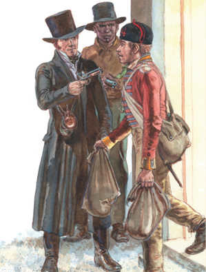 Not all of the slaves who fled or were taken from Chesapeake plantations joined the British. Before Bellefields Plantation owner Benjamin Oden escaped from the British invasion with his slaves in August of 1814, he was seeking a runaway named Frederick Hall. It appears that the light- skinned, 22-year-old Hall could and did pass as a white man. He soon appeared as Private William Williams on the muster rolls of the 38th Regular U.S. Infantry. He collected his $50 cash bonus for enlisting and private’s wages of $8 a month.