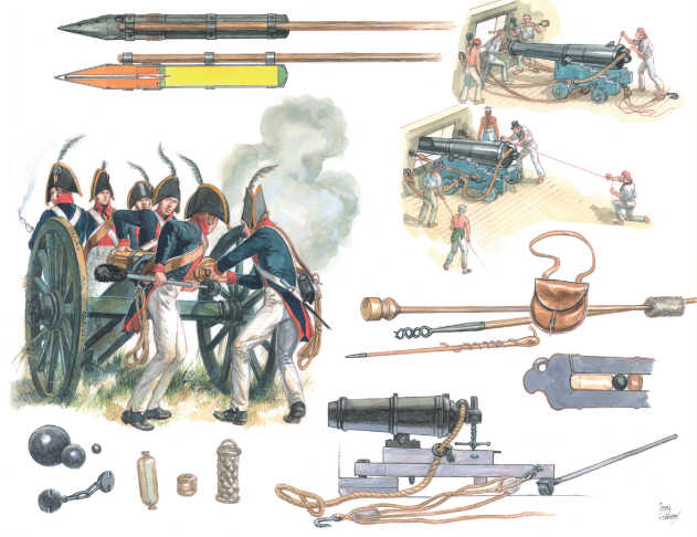 (upper left) Congreve rocket; (upper right) a naval long gun being loaded and then hauled forward ready for firing;