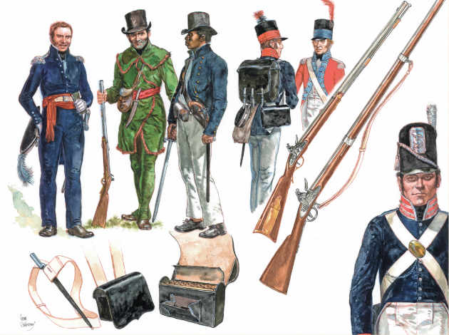 progressed; a Maryland militia rifleman; a flotillaman, armed with typical cutlass, cartridge box, and a pistol clipped to his