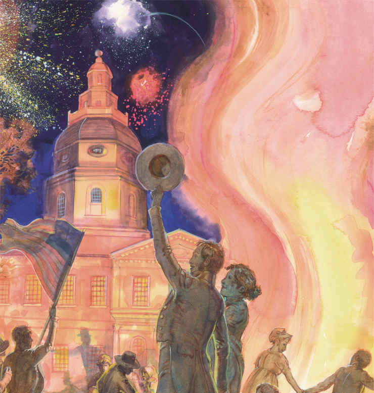 Other towns celebrated in similar fashion. Baltimore rejoiced with its own version of Congreve rockets that pierced the sky. Alexandria called for a day of thanksgiving, then "brilliantly illuminated” its downtown. Norfolk chose a festive public dinner before lighting its lamps. Annapolitans used their prominent, illuminated State House as the centerpiece for cannon blasts, ringing bells, and grand bonfires. The Maryland Gazette reported, "In the midst of this scene of light stood the State House, conspicuous for its elevation and splendor.